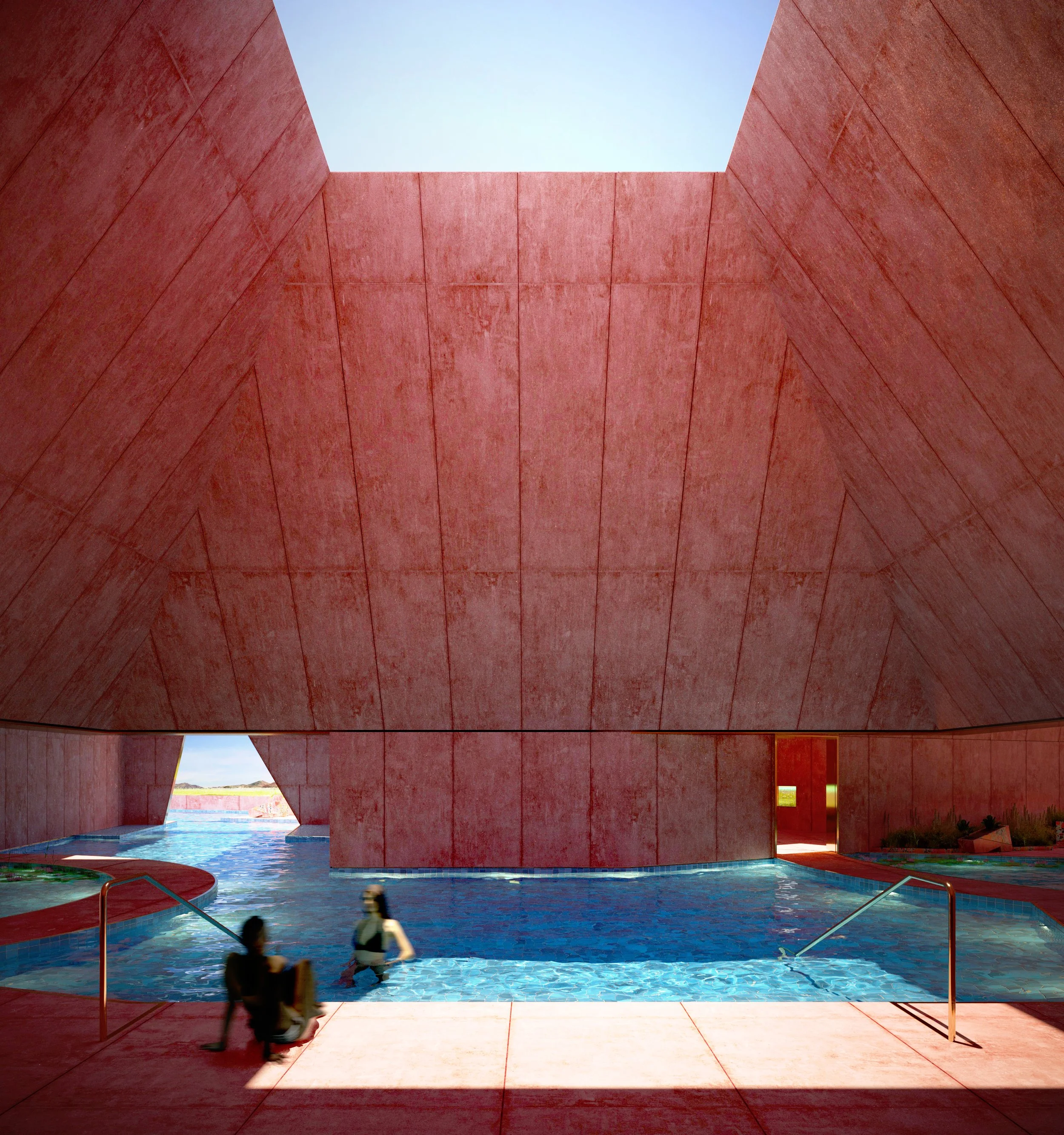 This project envisions a new typology in the American West by pairing the leisure activities of a bathhouse with the utilitarian functions of a data center. Why not capitalize on the wasted heat? Located near a resort, Pink Thermal Baths is the new destination getaway to recharge your body and soul. Like the ephemerality of the global data flows, the center is fully subterranean and hidden from sight. All the visual, auditory, and olfactory experiences are concentrated within the exuberant colorful interiors of the square bathhouse. The excess heat from the servers is dispersed into the pools, providing a hot spring-like experience, while the conic shapes of the various rooms add a touch of calming monumentality and help to control interior air temperatures.