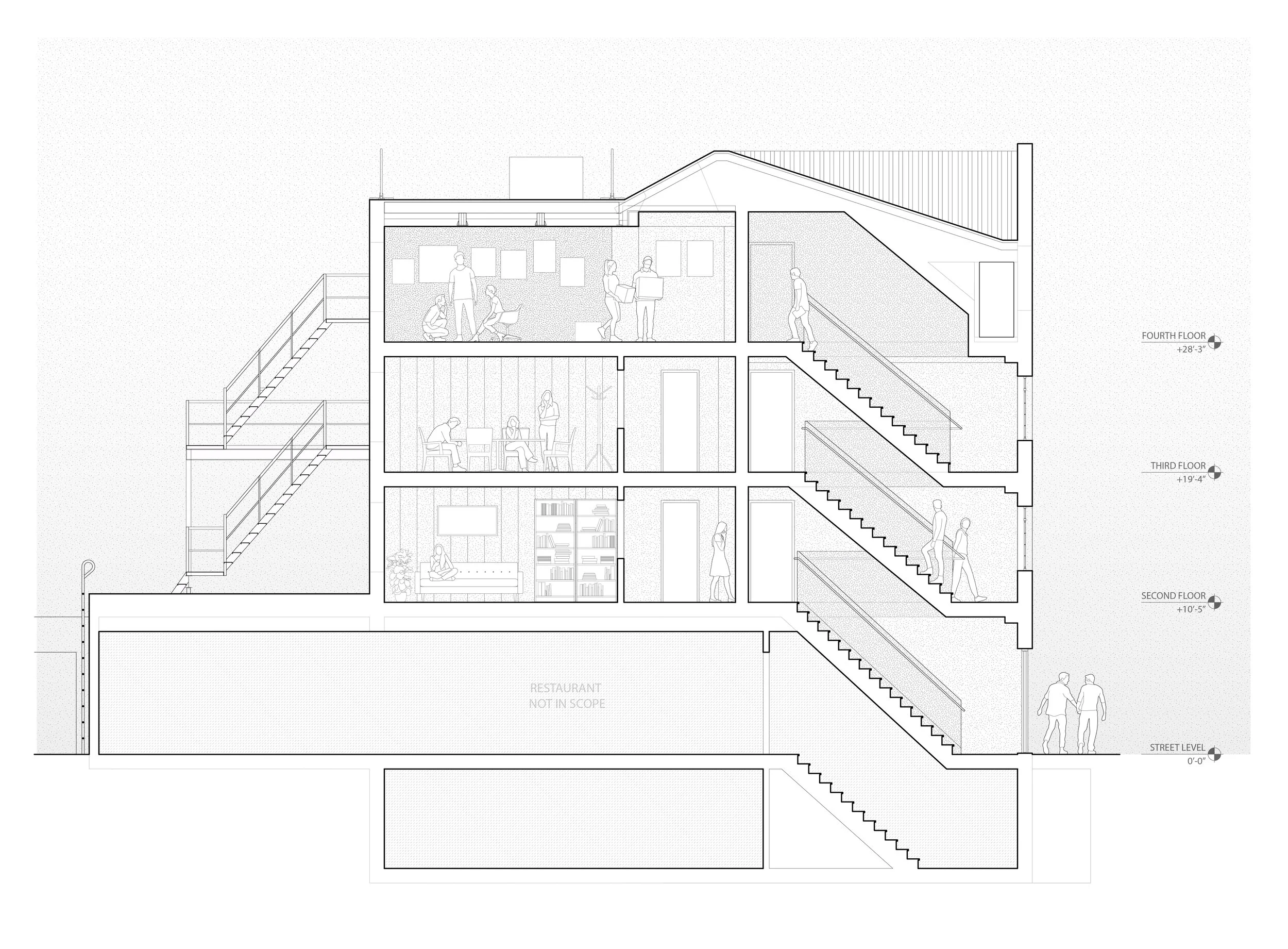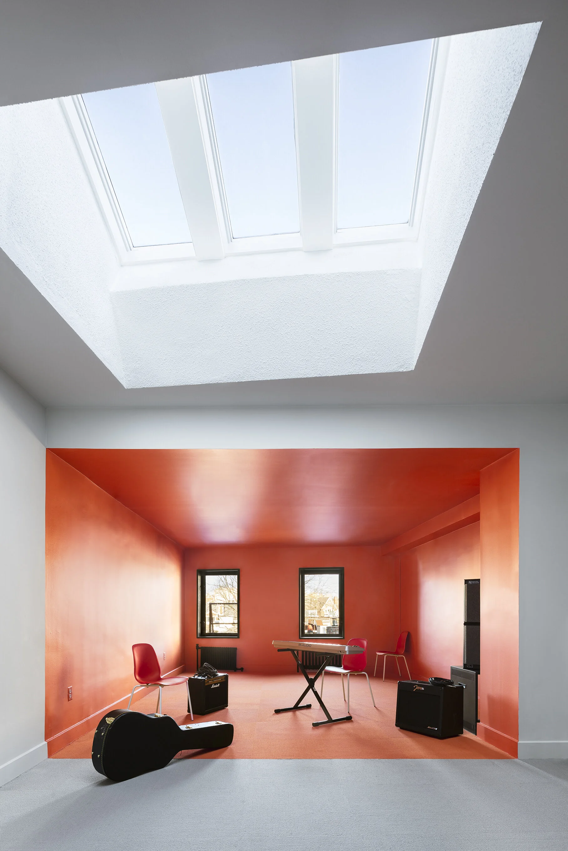 The task was to convert the three upper stories of residential units into recording spaces and meeting areas for the student-run radio station WYBCx, in New Haven, Connecticut, while allowing for full operations of the existing restaurant on the ground level. The design focused primarily on the studio and recording room on the fourth floor and the vertical circulation space, assuring that the newly renovated building is fully up to commercial code.