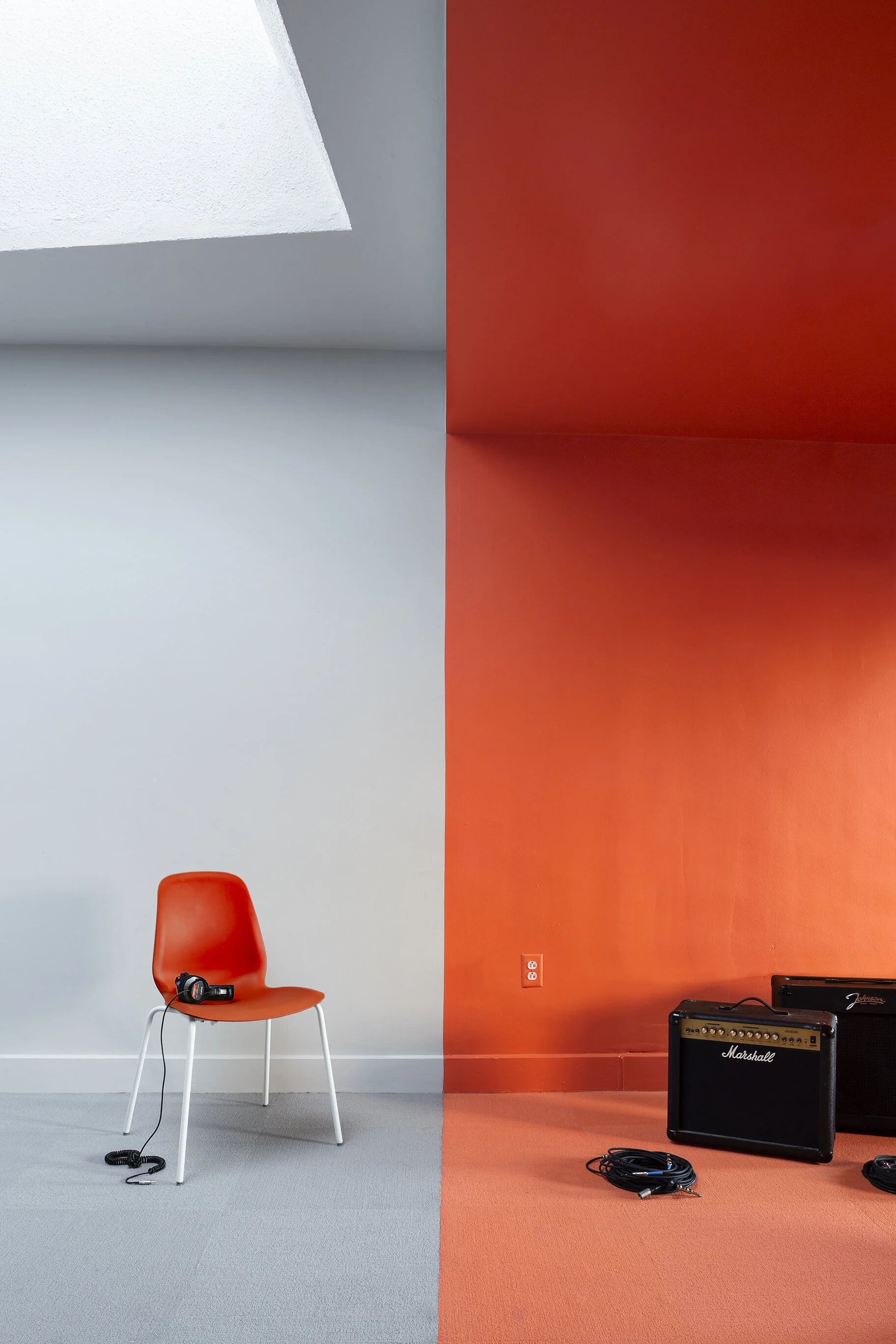 As a student run radio station, it was important to define certain program spaces for recording and performing within the top floor of the project. The bright red color of the fourth-floor performance space visually unifies the ceiling, walls, and the carpeted floor. This volumetric color block aligns with the edge of the newly-reinforced dropped ceiling, creating an all-encompassing visual experience. A soft cooler gray is applied to the broadcasting zone. The modest space of the central stair was complete with a simple continuous dark guardrail that works within the limitations for the existing stairwell. The black color ties the circulation spaces together from the fourth floor down to the ground level.